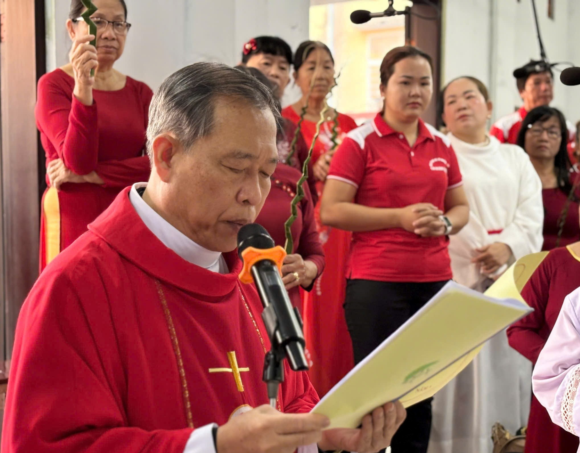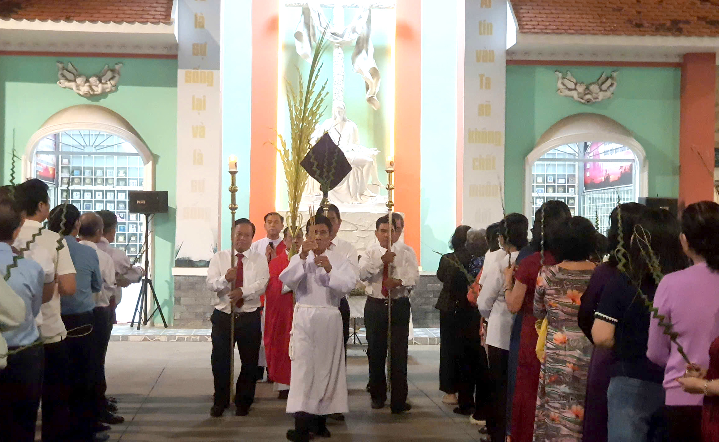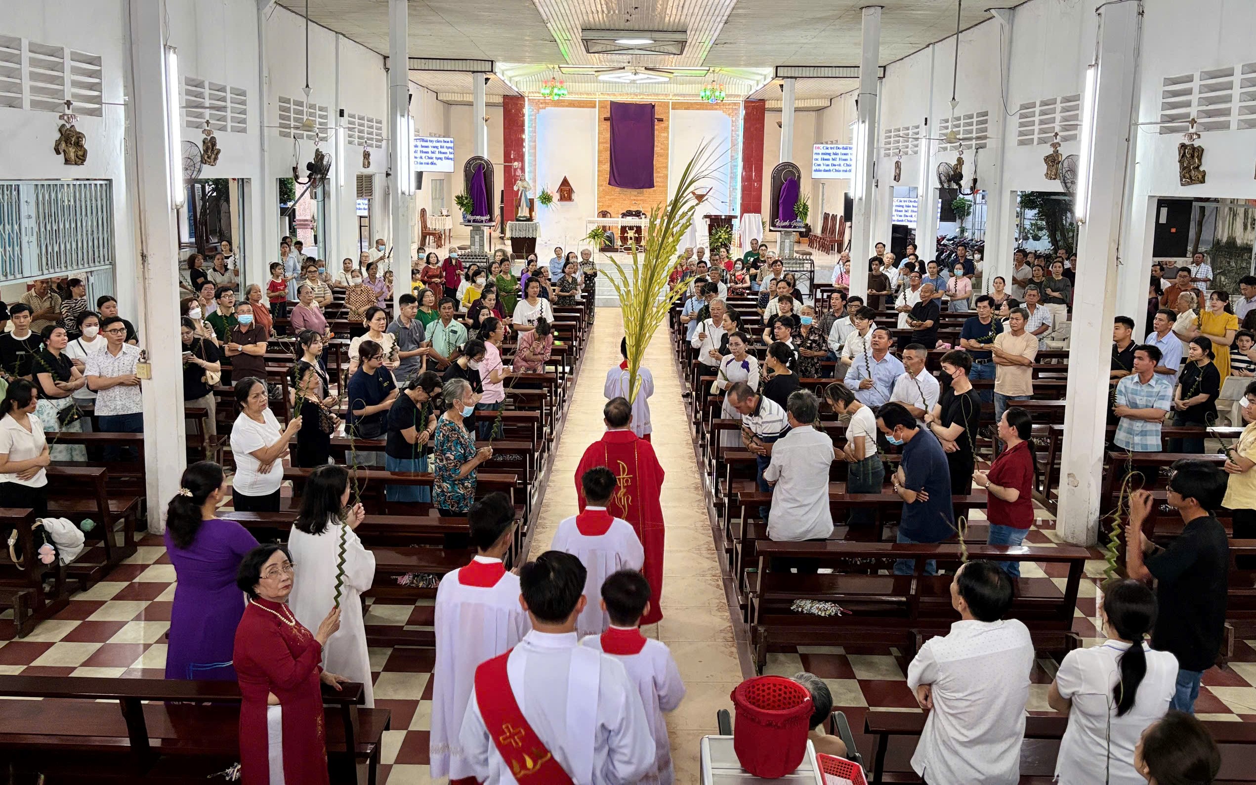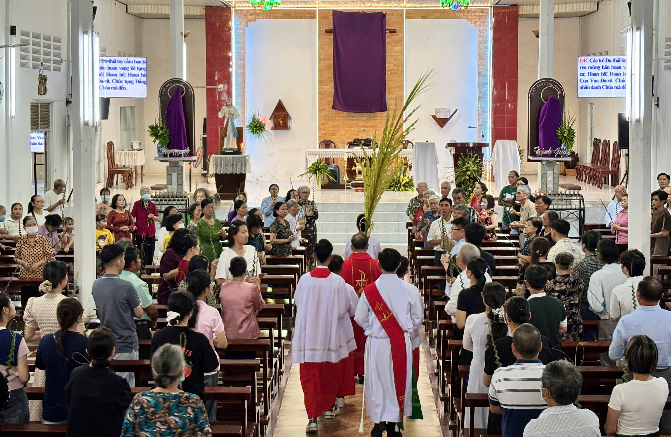 Trong bầu khí trang nghiêm, cộng đoàn cùng cử hành nghi thức làm phép lá và kiệu lá, tưởng nhớ biến cố Chúa Giêsu long trọng tiến vào thành thánh Giêrusalem, hoàn tất mầu nhiệm Vượt Qua đem lại ơn cứu độ cho nhân loại.
