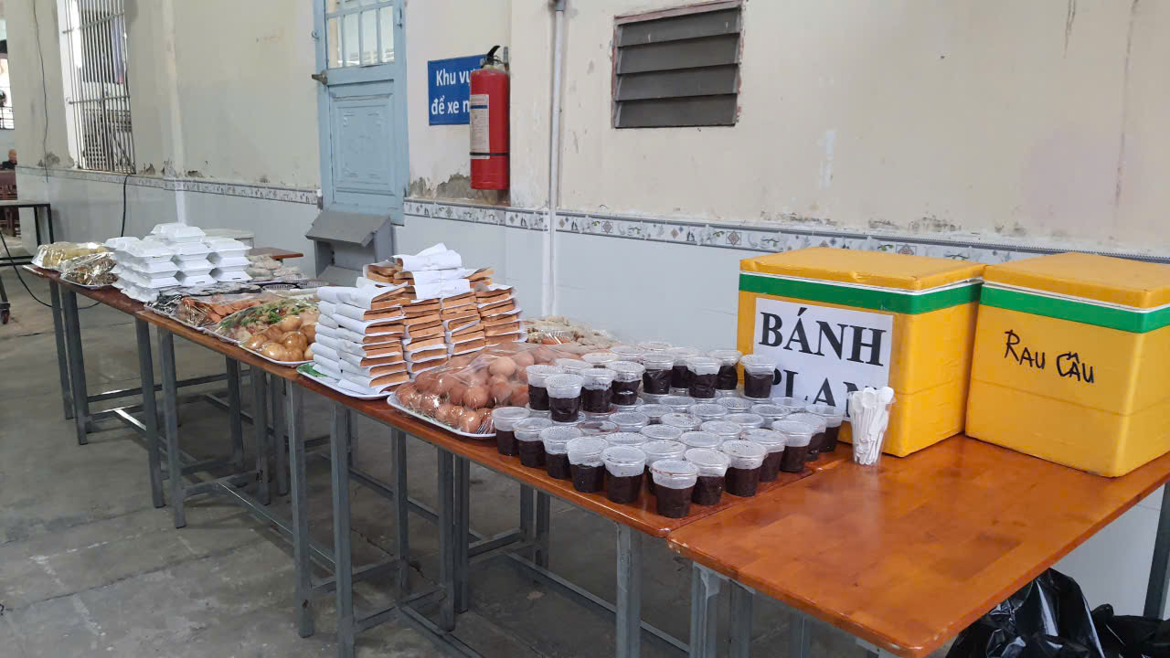 Trên các dãy bàn dài trong khuôn viên nhà xứ, từng món ăn được các khu, các ban ngành chuẩn bị từ sớm: sushi của Khu 1, Khu 2, Bánh mì Sandwich kẹp pate + chả lụa, xôi mặn Khu 3, rau câu của Khu 4, thịt heo quay bánh hỏi của Khu 5, cơm chiên cá mặn Khu 6, nem nướng Khu 7, xôi đậu phộng Khu 8; rồi bánh flan, bánh bao chiên, hột gà luộc, chè đậu đen, chả giò, bò viên…