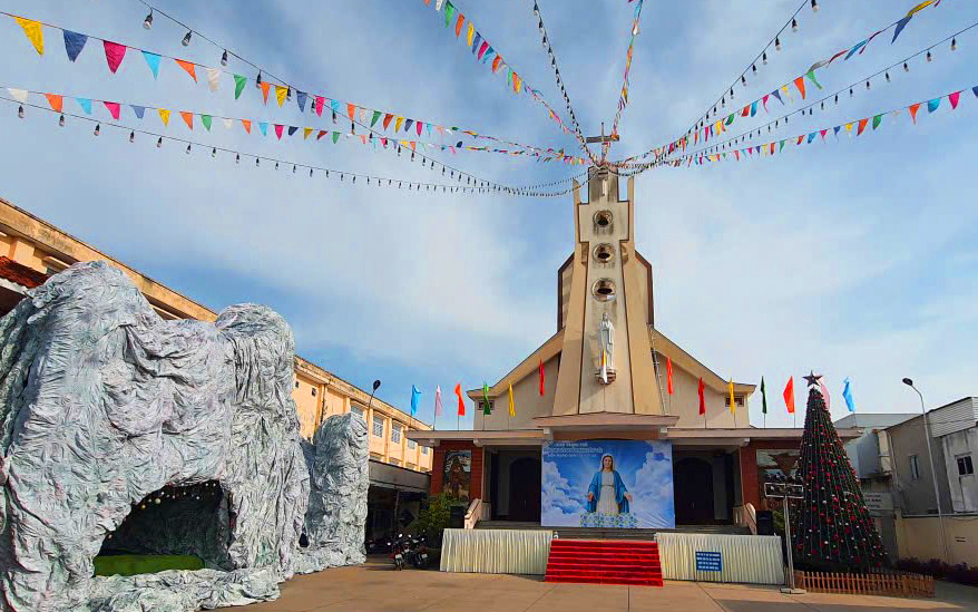 Trước tiền sảnh, hình ảnh Đức Mẹ với đôi tay rộng mở, gương mặt hiền từ tỏa sáng giữa nền trời xanh, khiến ai bước vào khuôn viên nhà thờ cũng cảm nhận được một sự bình an rất riêng, một cảm giác được Mẹ đón nhận, chở che và ôm ấp bằng tình yêu vô nhiễm của Người.