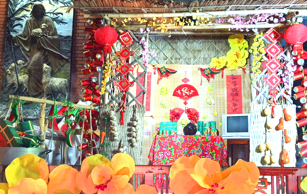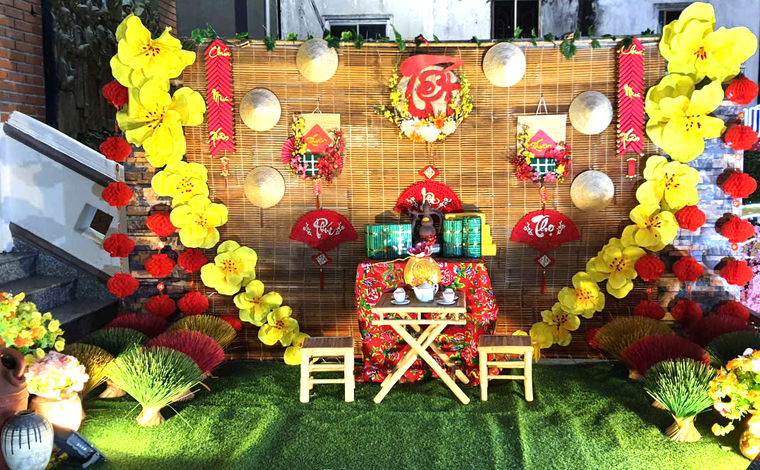 Có góc gợi nhớ Tết quê với nồi bánh tét, bếp lửa; có góc rực rỡ bên tượng Đức Mẹ, giữa hoa lá và chong chóng.