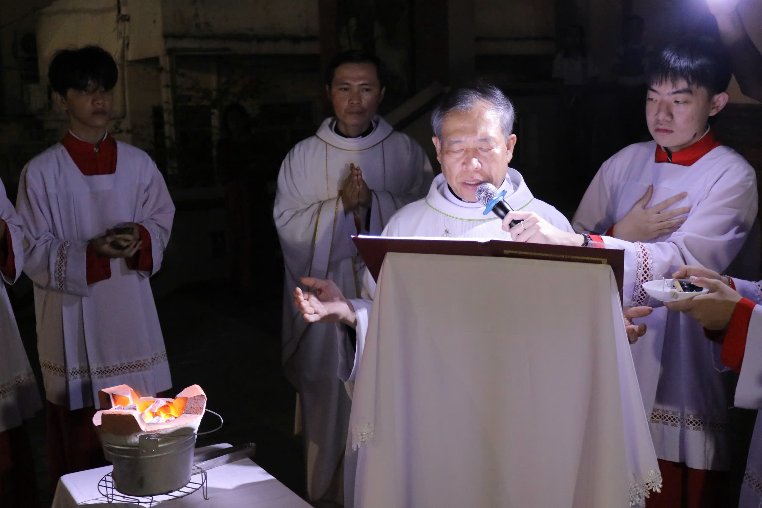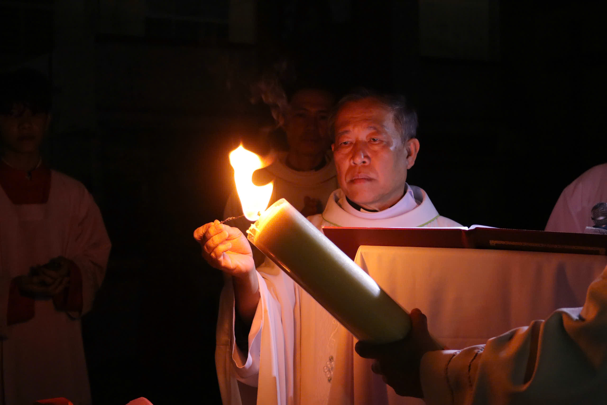 Mở đầu phụng vụ là nghi thức làm phép lửa mới và thắp Nến Phục Sinh. Trong khung cảnh nhà thờ chìm trong bóng tối, ánh lửa mới được thắp lên như dấu chỉ của Đức Kitô – Ánh Sáng thật đến chiếu soi trần gian. Từ ngọn lửa mới, Nến Phục Sinh được thắp sáng. Ánh sáng từ cây nến dần lan tỏa đến từng ngọn nến trên tay giáo dân, diễn tả niềm tin sống động rằng ánh sáng phục sinh của Chúa có sức phá tan bóng tối của tội lỗi, tuyệt vọng và sự chết.